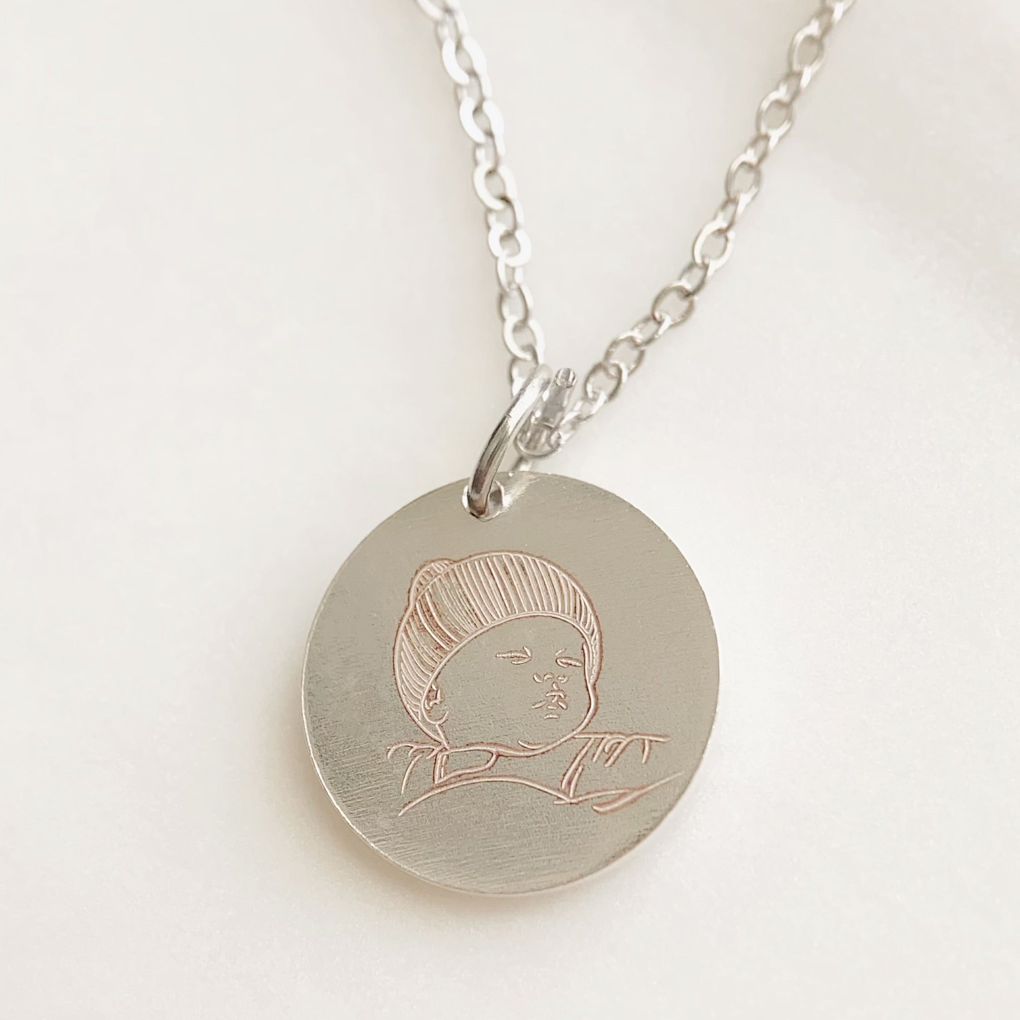 Silver Hand Drawn Baby Portrait Birth Medallion